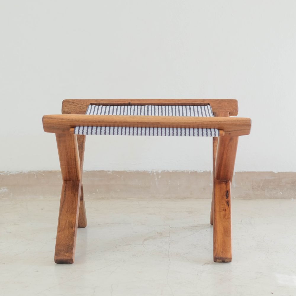 Banco de madera con forma de tijera, con un textil tejido a modo de asiento. Este banco tiene acabado natural, sin grietas, ideal como elemento utilitario por su resistencia y durabilidad SKU: ARTHOEXAS010