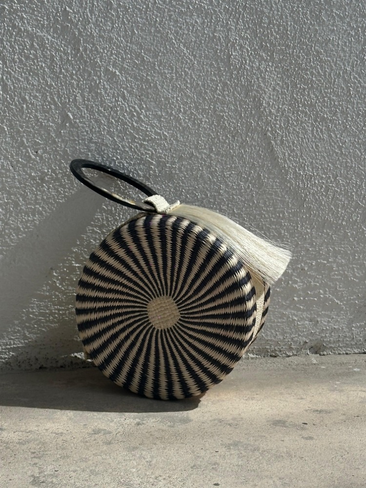 La Bolsa Nanda es una pieza artesanal elaborada a partir de jipijapa tejido a mano, una fibra vegetal tradicional trabajada mediante técnicas ancestrales. Su diseño circular se complementa con un mechón de sansevieria y asas de cuerno de toro recuperado, integrando materiales naturales que aportan textura, resistencia y carácter a la pieza.