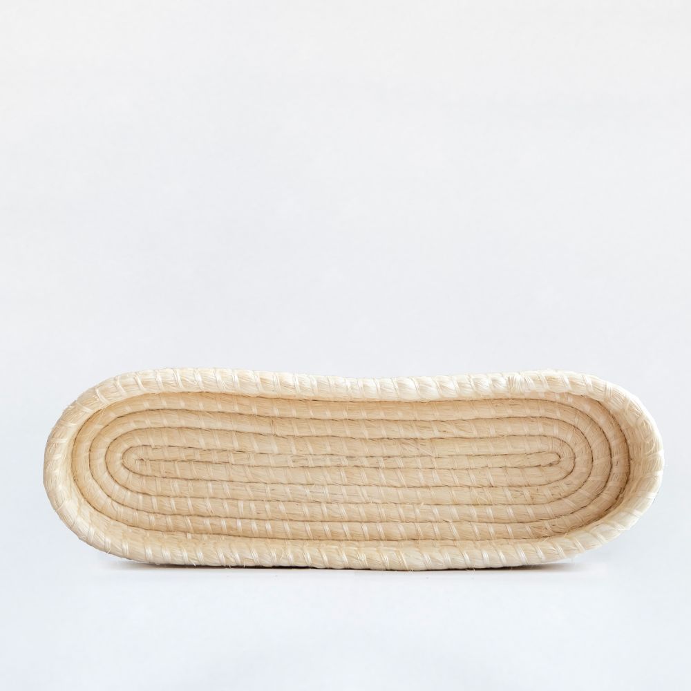 Este cesto para baguette está hecho con la técnica de henequén costurado en colores amarillo, azul, gris y tzalam. Sus acabados tienen un corchado uniforme y de costuras firmes. Es una pieza utilitaria de gran practicidad y resistencia, y refleja la maestría y creatividad de las artesanas que trabajan esta técnica.