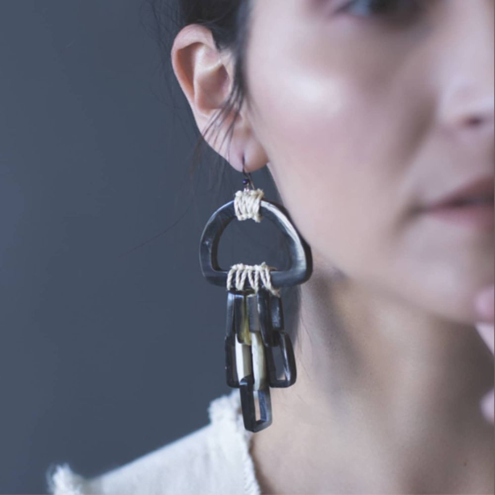 Los aretes Río están inspirados en la sabiduría de la naturaleza. Las piezas son de cuerno tallado recuperado, con detalles de tejido de fibra de sansevieria teñida con plantas medicinales de la región. Elaborados en colaboración con Caralarga.