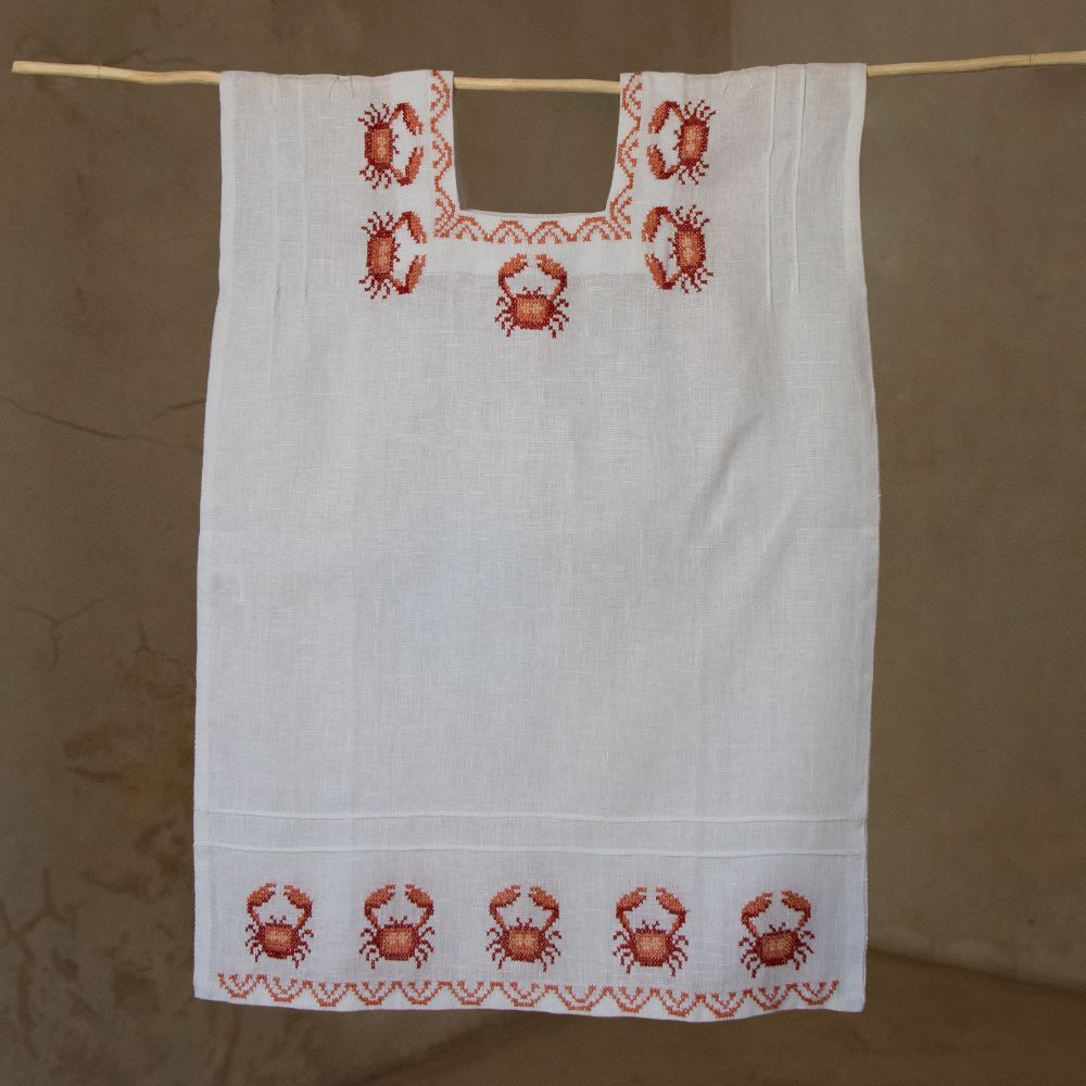 Huipil de lino con bordado a mano en punto de cruz con diseño de cangrejos. Una prenda fresca y tradicional de la Península que muestra las grandes habilidades de las maestras artesanas que dominan la técnica de bordado.