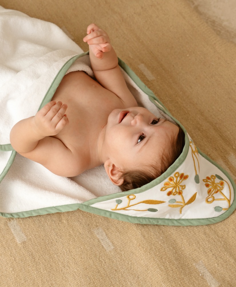 Santo Domingo, Yucatán La Toallita Lipia es una toalla con gorrito, diseñada para envolver a tu bebé con suavidad y calidez después del baño. Su forma facilita cubrir la cabeza y el cuerpo al mismo tiempo, acompañando los momentos de cuidado diario con ternura y funcionalidad. Bordada a máquina por artesanas de Santo Domingo, Yucatán, cada flor de lipia evoca el equilibrio natural que las abejas meliponas ayudan a preservar. Esta técnica tradicional de bordado a máquina requiere precisión, sensibilidad y conocimiento textil transmitido entre generaciones. Color: Blanco Técnica artesanal: Bordado a máquina Materiales: Felpa rasurada y jersey blanco Medidas: 74 x 80 cm SKU: TAMNIBMAB02101501